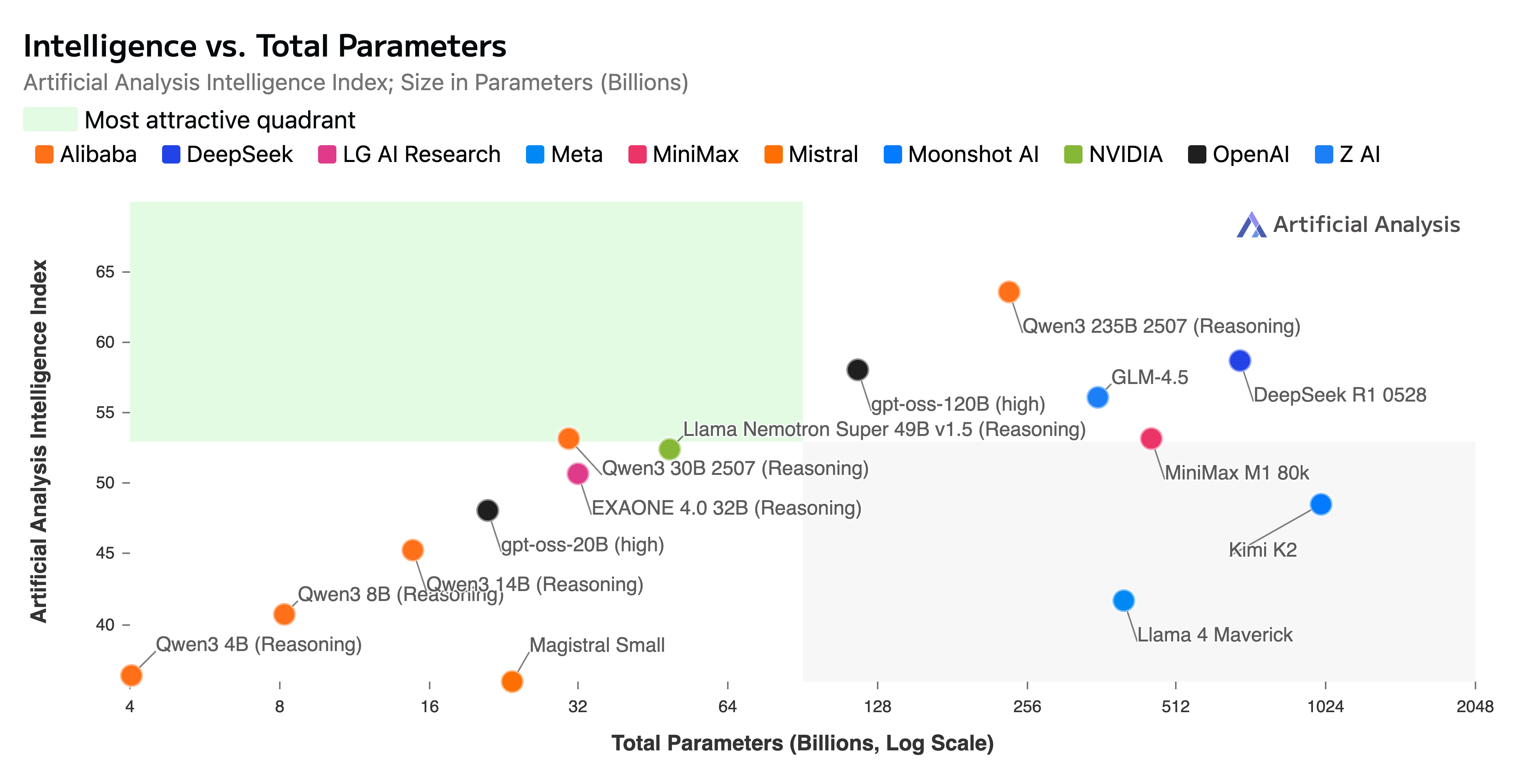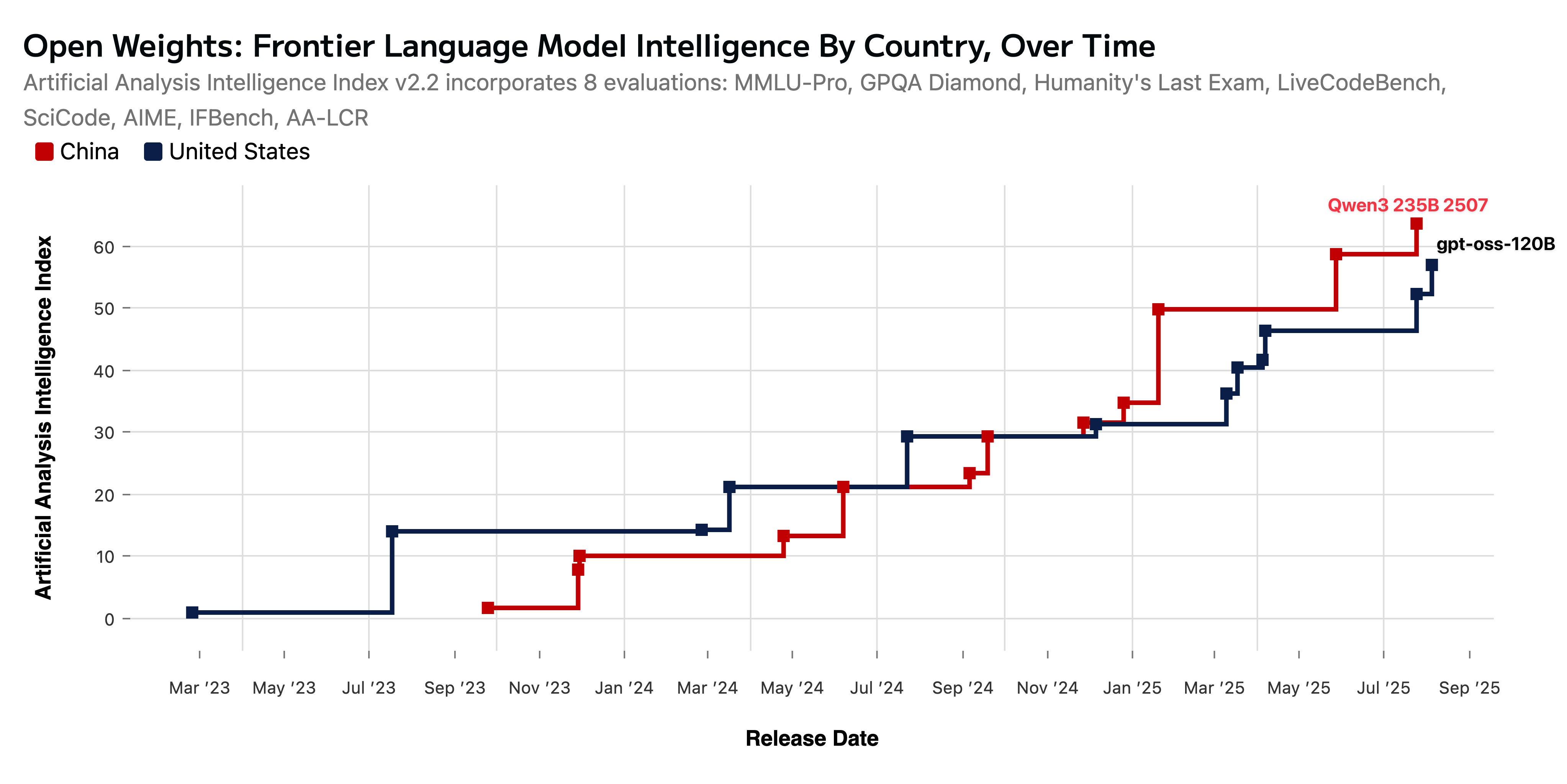 gpt-oss-120b is now the leading US open weights model. Qwen3 235B from Alibaba is the leading Chinese model and offers greater intelligence, but is much larger in size (235B total parameters, 22B active, vs gpt-oss-120B's 117B total, 5B active)