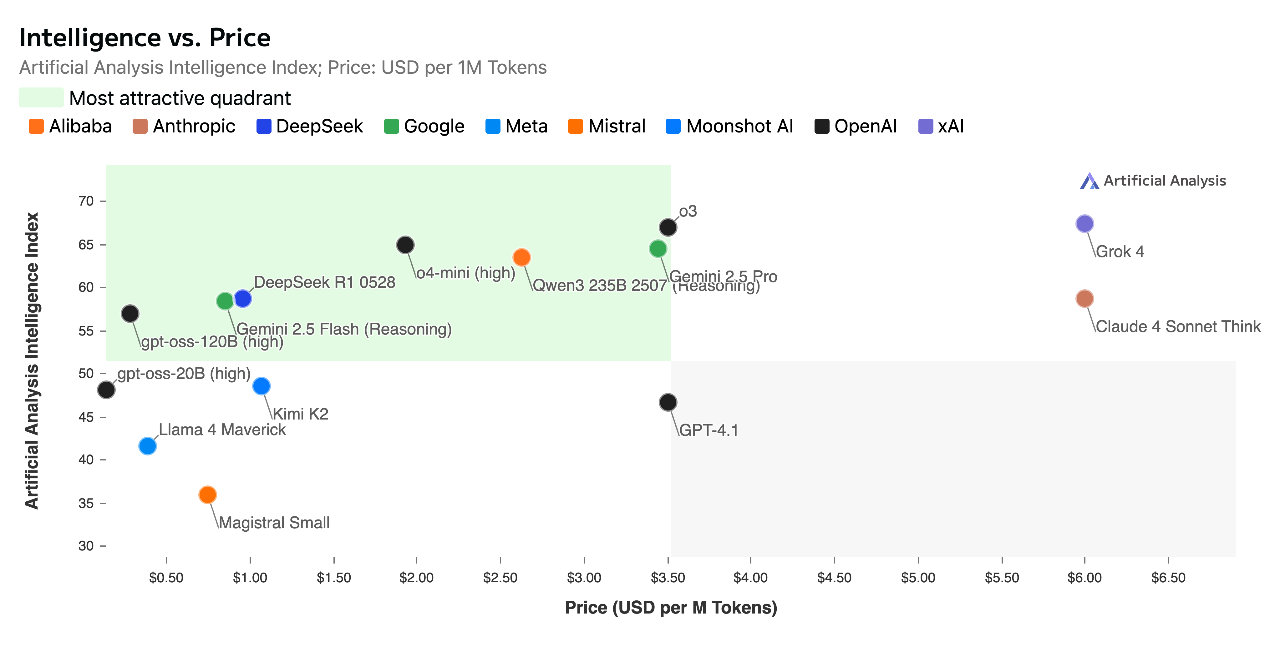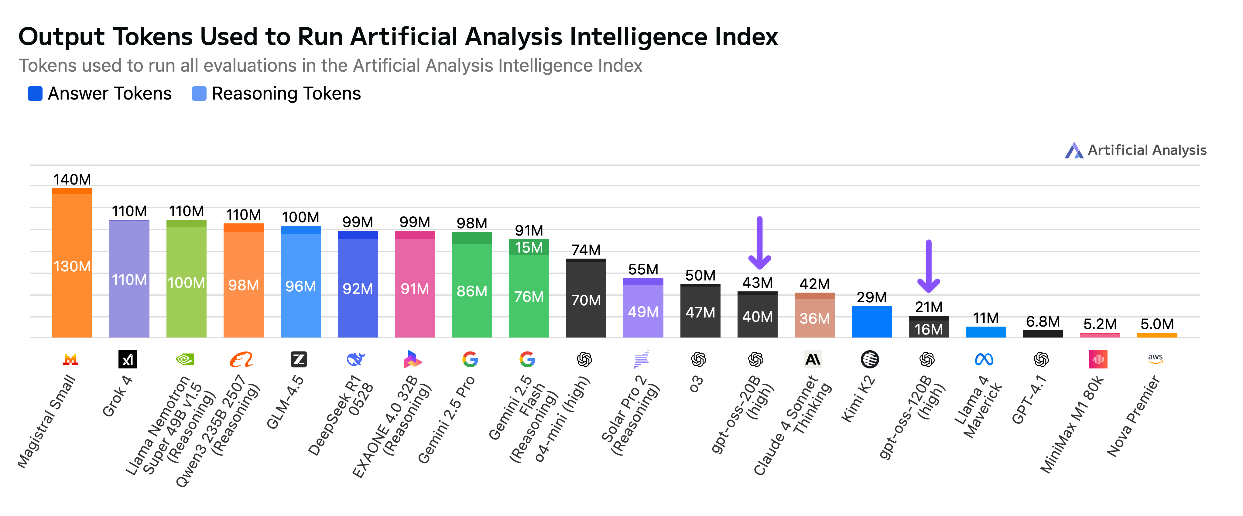 Output token usage: Relative to other reasoning models, both models are quite efficient even in their 'high' reasoning modes, particularly gpt-oss-120b which used only 21M tokens to run our Artificial Analysis Intelligence Index benchmarks. This is 1/4 of the tokens o4-mini (high) took to run the same benchmarks, 1/2 of o3 and less than Kimi K2 (a non-reasoning model).