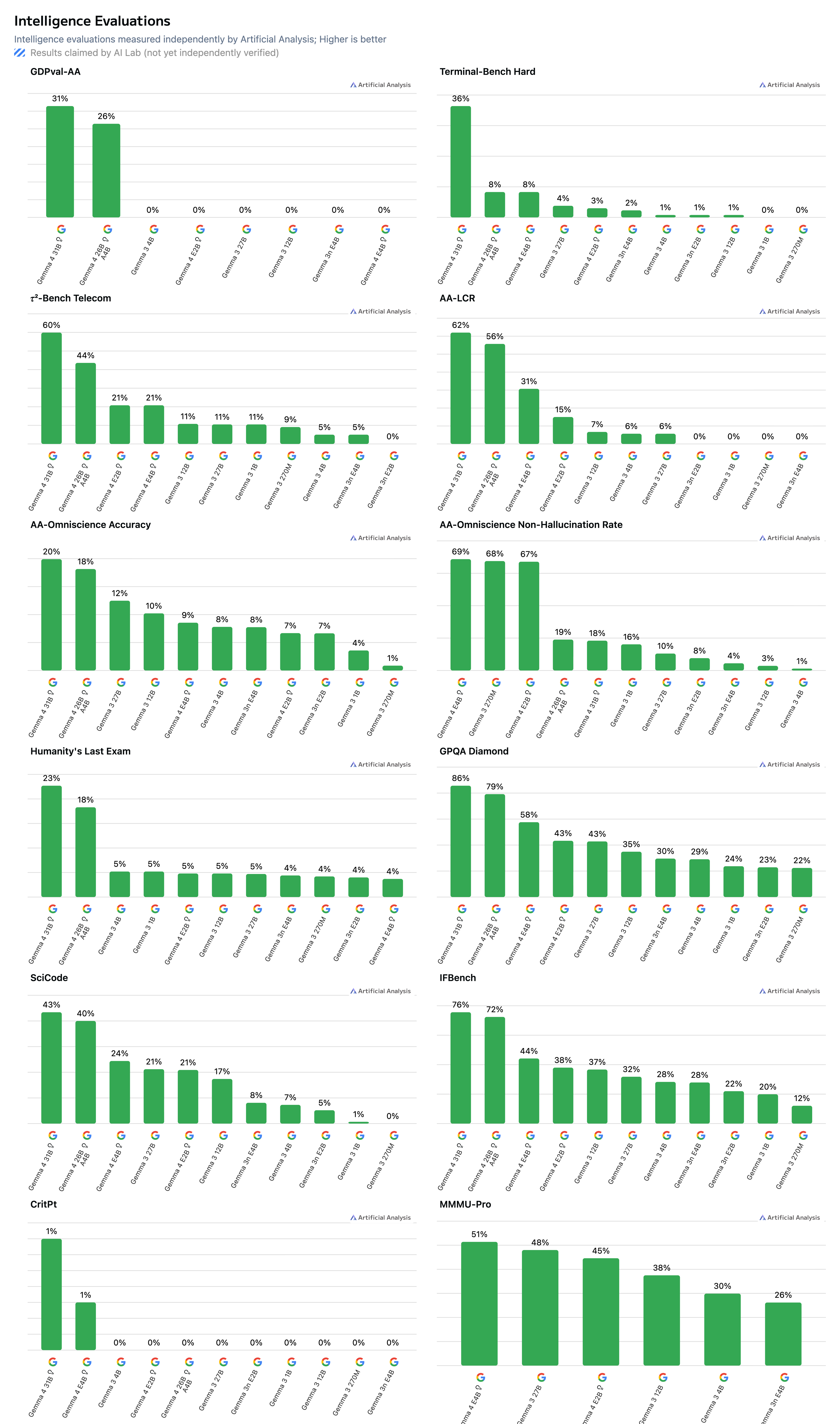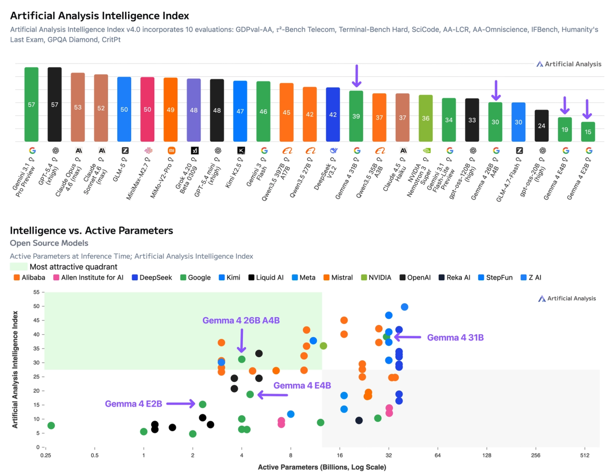 Google has released Gemma 4, four open weights models with multimodality support. The flagship 31B model (39 on the Intelligence Index) uses ~2.5x fewer output tokens than Qwen3.5 27B (Reasoning, 42) but trails it by 3 points on intelligence