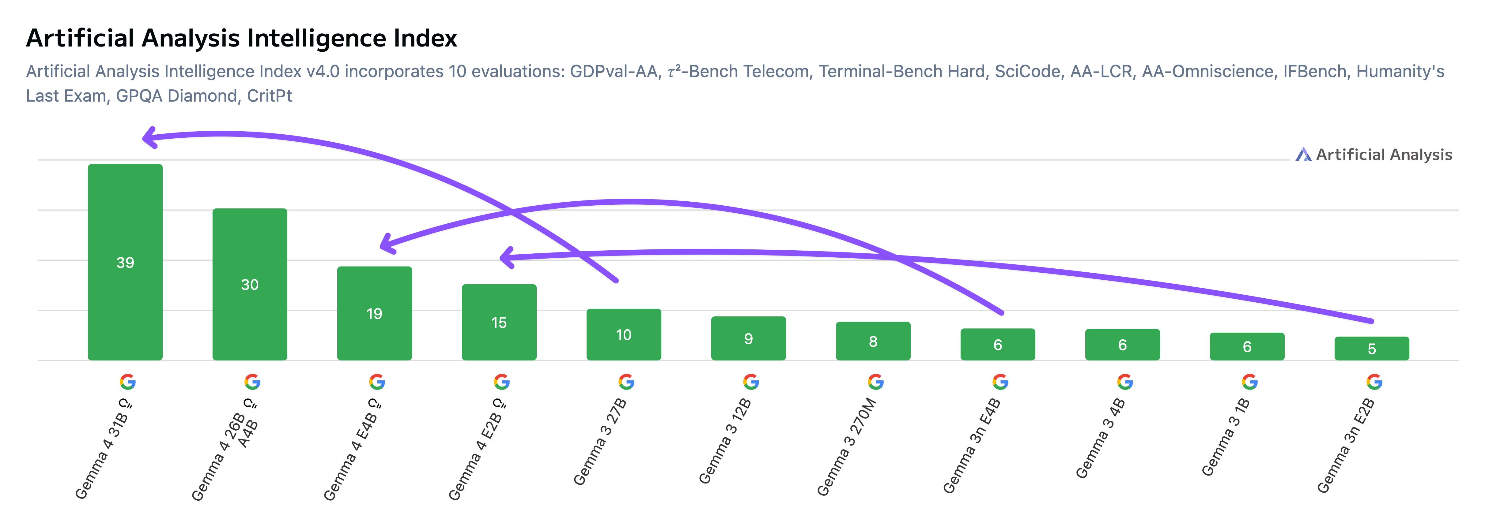 The generational jump in intelligence from Gemma 3 to Gemma 4 is large. Gemma 4 31B (39) is +29 points over Gemma 3 27B Instruct (10). Gemma 4 E4B (19) is +13 over Gemma 3n E4B (6)