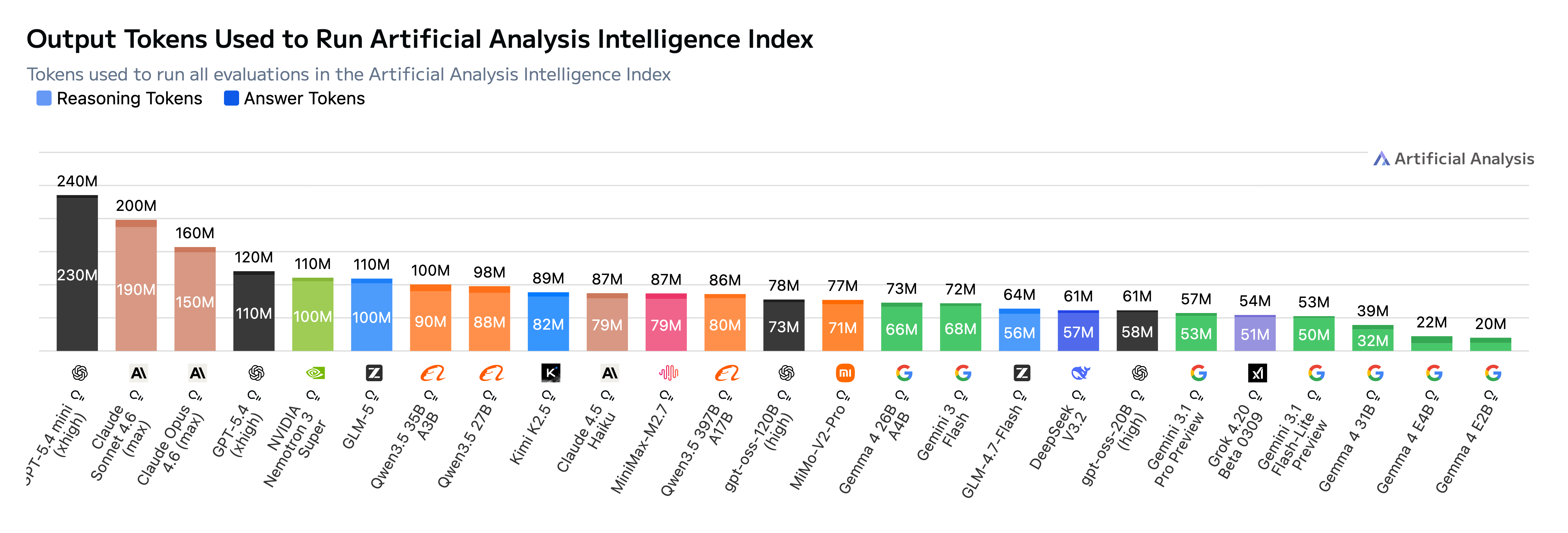 Gemma 4 31B used just 39M output tokens to run the Intelligence Index, making it more token efficient than other reasoning models at this intelligence level. Qwen3.5 27B used 98M and GLM-4.7 used 167M for similar or marginally higher scores