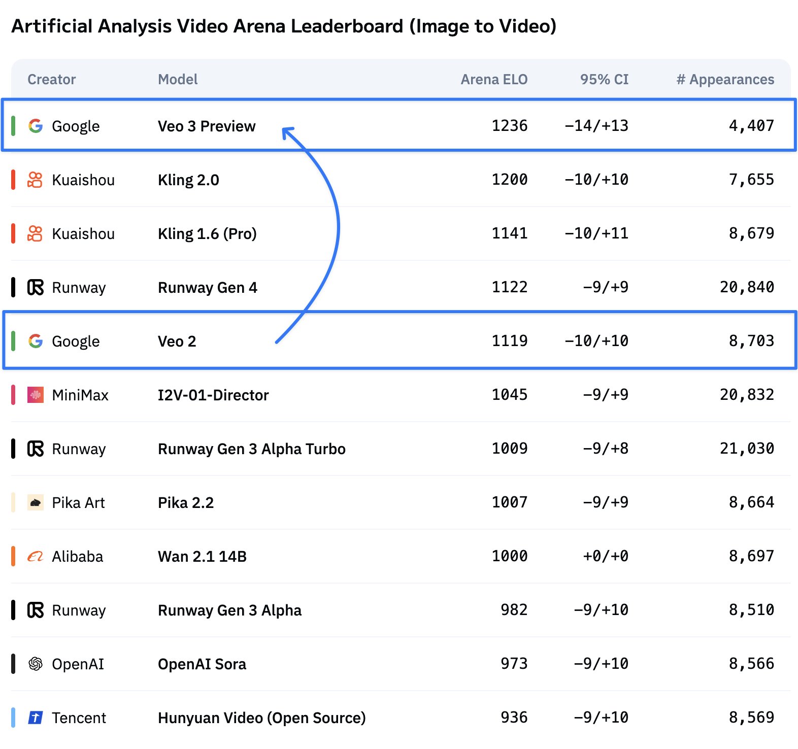 Veo 3 is also now the first model to top both the Image to Video and Text to Video leaderboards, outperforming Kling 2.0 and Runway Gen 4 to secure the #1 spot across both modalities!