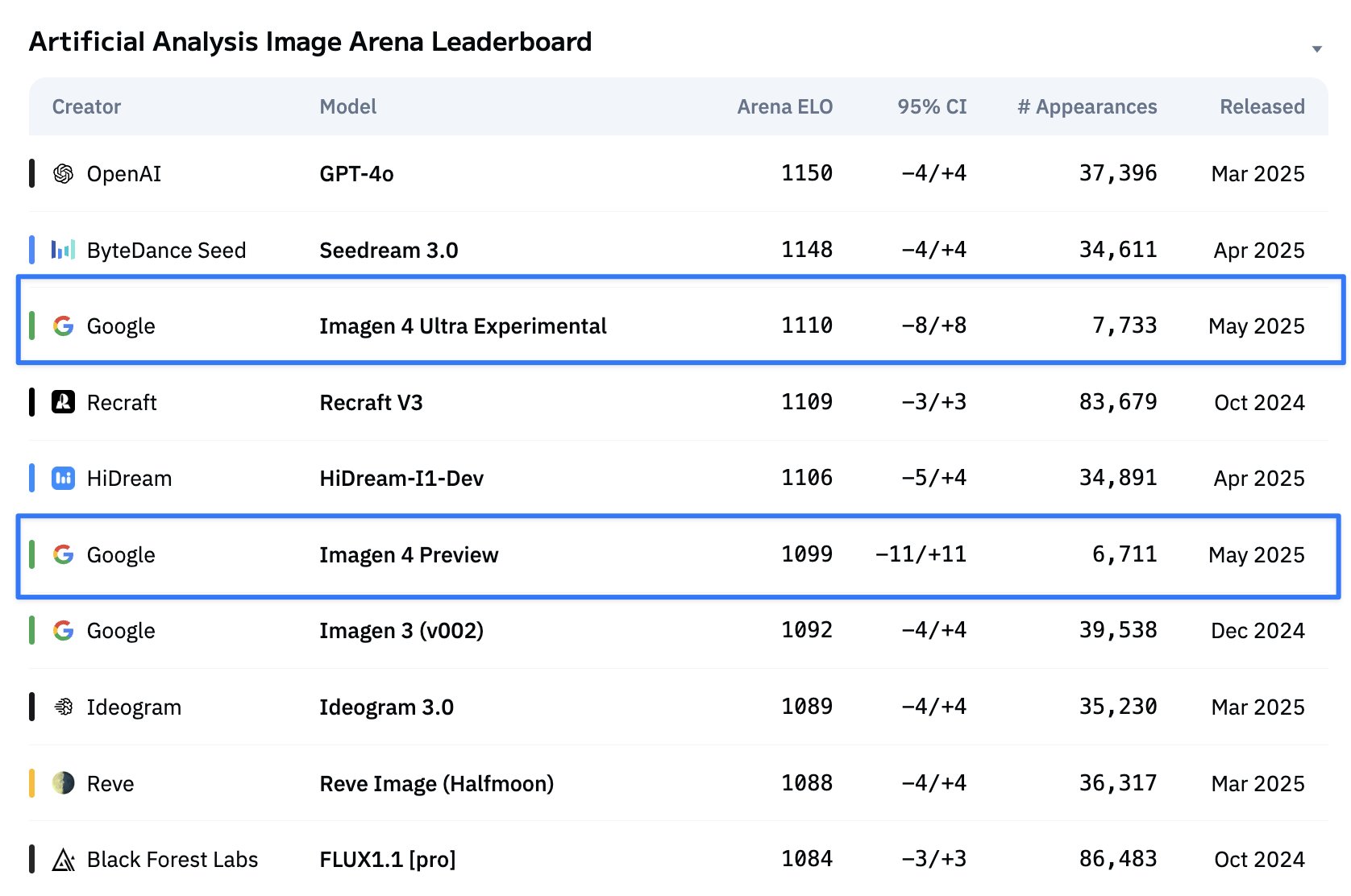 Image models: Google's new Imagen 4 Ultra comes 3rd in the Artificial Analysis Image Arena, falling just short of OpenAI's GPT-4o and ByteDance's Seedream 3.0