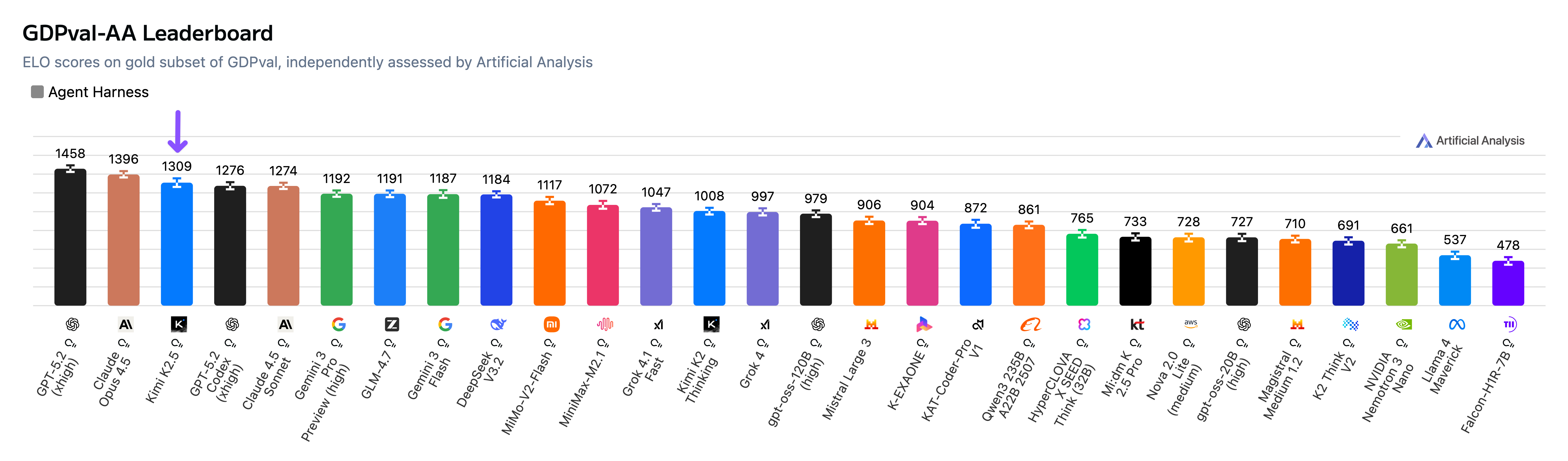Kimi K2.5 debuts with an Elo score of 1309 on the GDPval-AA Leaderboard, implying a win rate of 66% against GLM-4.7, the prior open weights leader.