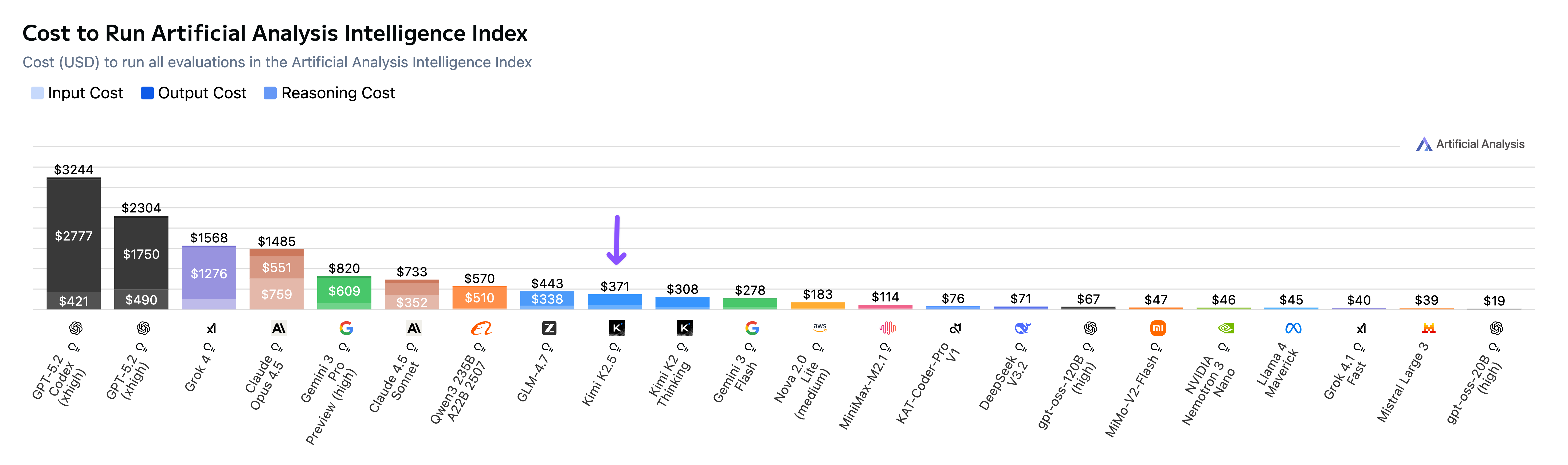 Kimi K2.5 costs $371 to run the Artificial Analysis Intelligence Index, making it more expensive than other open weights models but significantly cheaper than frontier proprietary models.
