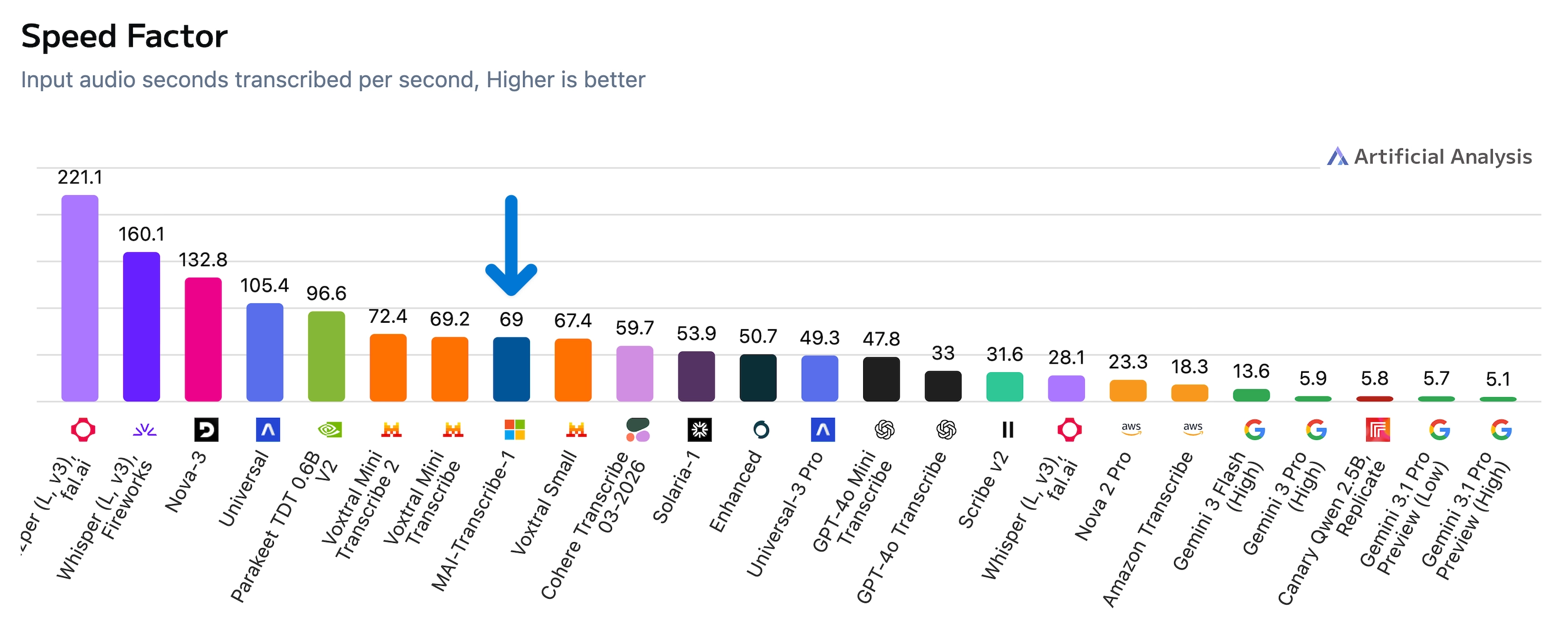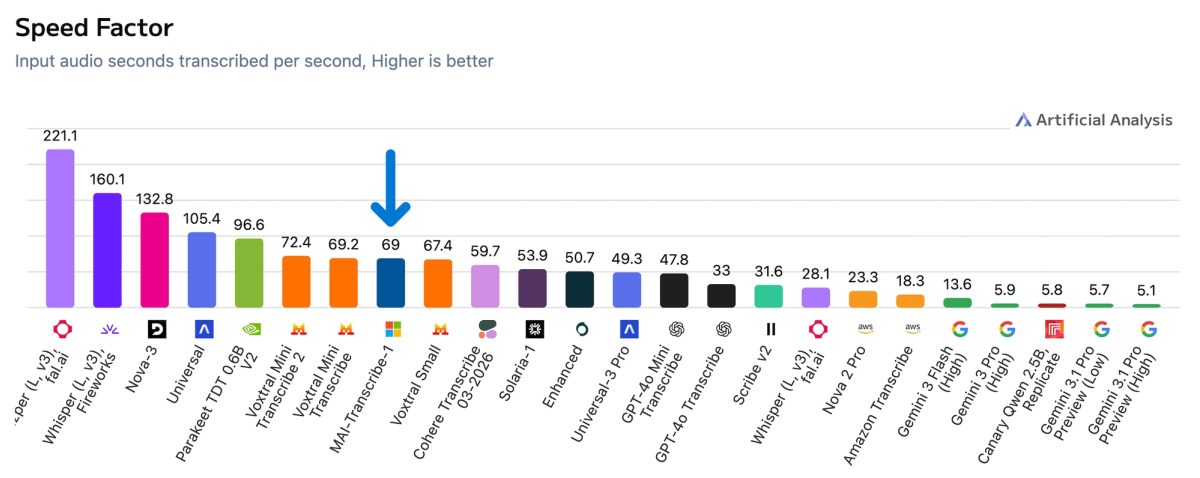 On speed, MAI-Transcribe-1 transcribes approximately 69 seconds of audio per second of processing, making it the fastest model in the top 5 by accuracy.