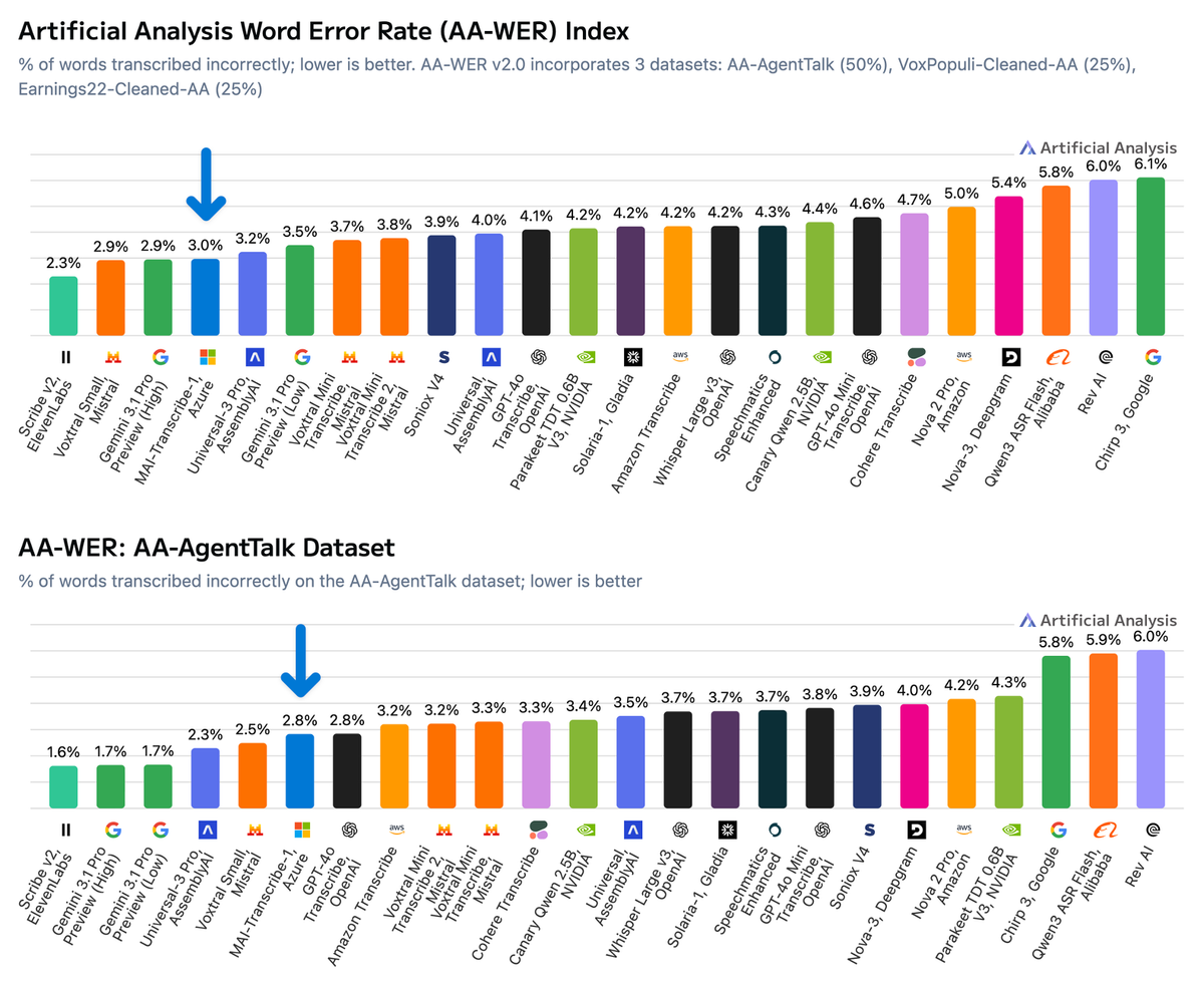 Microsoft has released MAI-Transcribe-1: a speech transcription model achieving 3.0% on AA-WER (#4), and is fast at 69x realtime