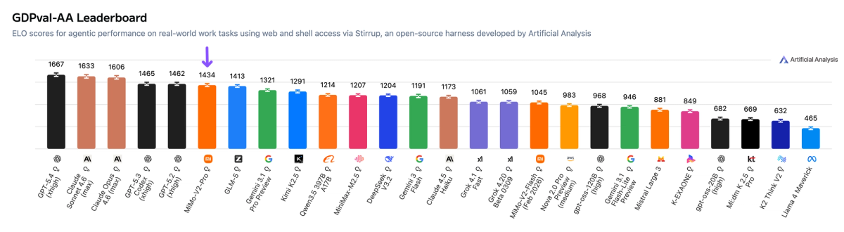 Leading Elo of 1426 on GDPval-AA (Agentic Real-World Work Tasks), ahead of peer models: On GDPval-AA, MiMo-V2-Pro places ahead of GLM-5 (Reasoning, 1406), Kimi K2.5 (Reasoning, 1283), and Qwen3.5 397B A17B (Reasoning, 1209). GPT-5.4 (xhigh) and Claude Sonnet 4.6 (Adaptive Reasoning, max effort) have an Elo of 1667 and 1633 respectively