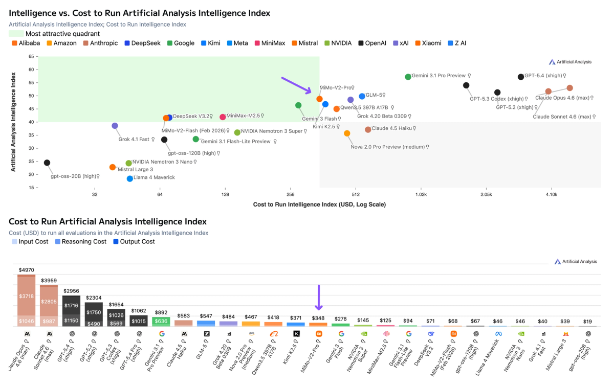 MiMo-V2-Pro cost $348 to run the Artificial Analysis Intelligence Index at $1/$3 per 1M input/output tokens and is on the Pareto frontier of the Intelligence Index vs. Cost to Run Intelligence Index chart