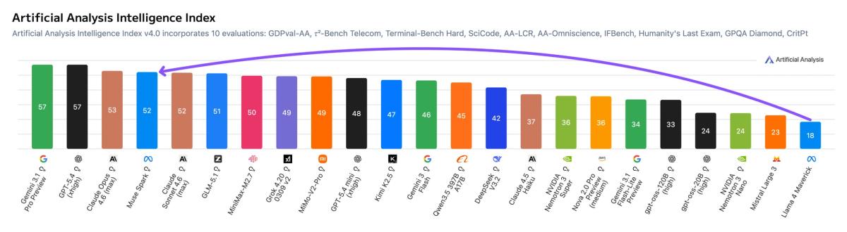 For context, Llama 4 Maverick and Scout scored 18 and 13 respectively on the Artificial Analysis Intelligence Index as non-reasoning models at the time of their release, while Muse Spark scores 52. Muse Spark essentially closes the gap between to the frontier in a single release.