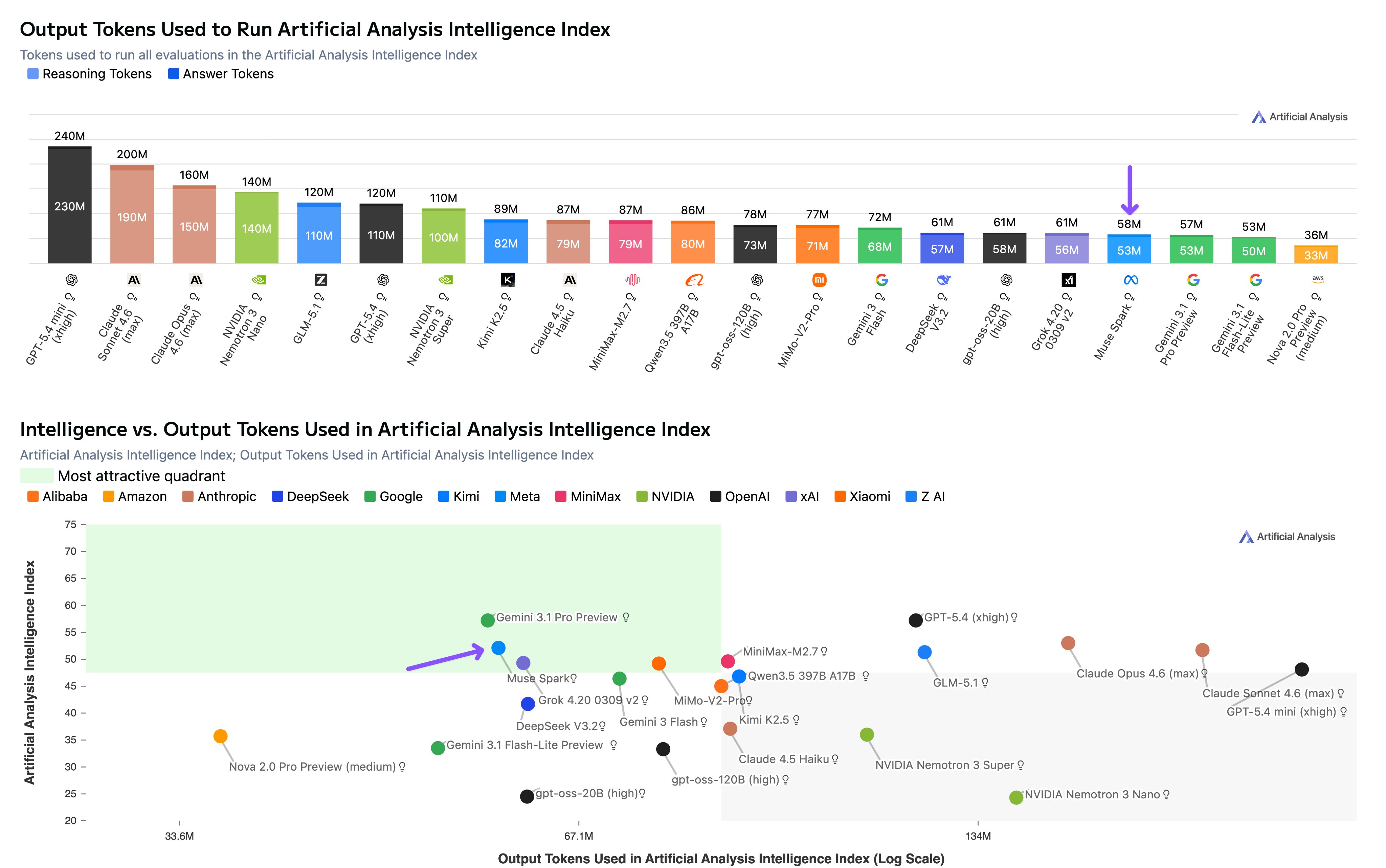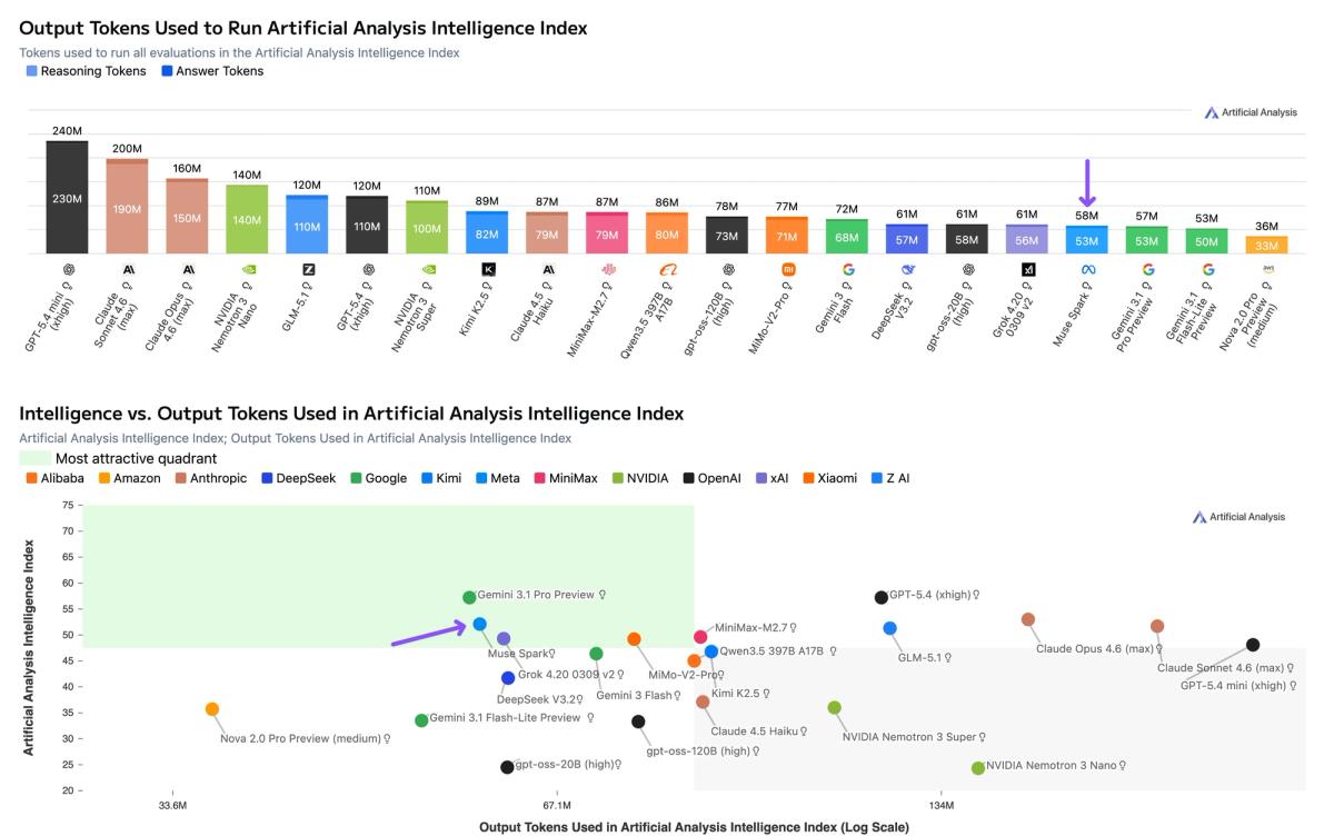 Muse Spark is notably token efficient for its intelligence level. It used 58M output tokens to run the Intelligence Index, comparable to Gemini 3.1 Pro Preview (57M) and notably lower than Claude Opus 4.6 (Adaptive Reasoning, max effort, 157M), GPT-5.4 (xhigh, 120M) and GLM-5 (110M)