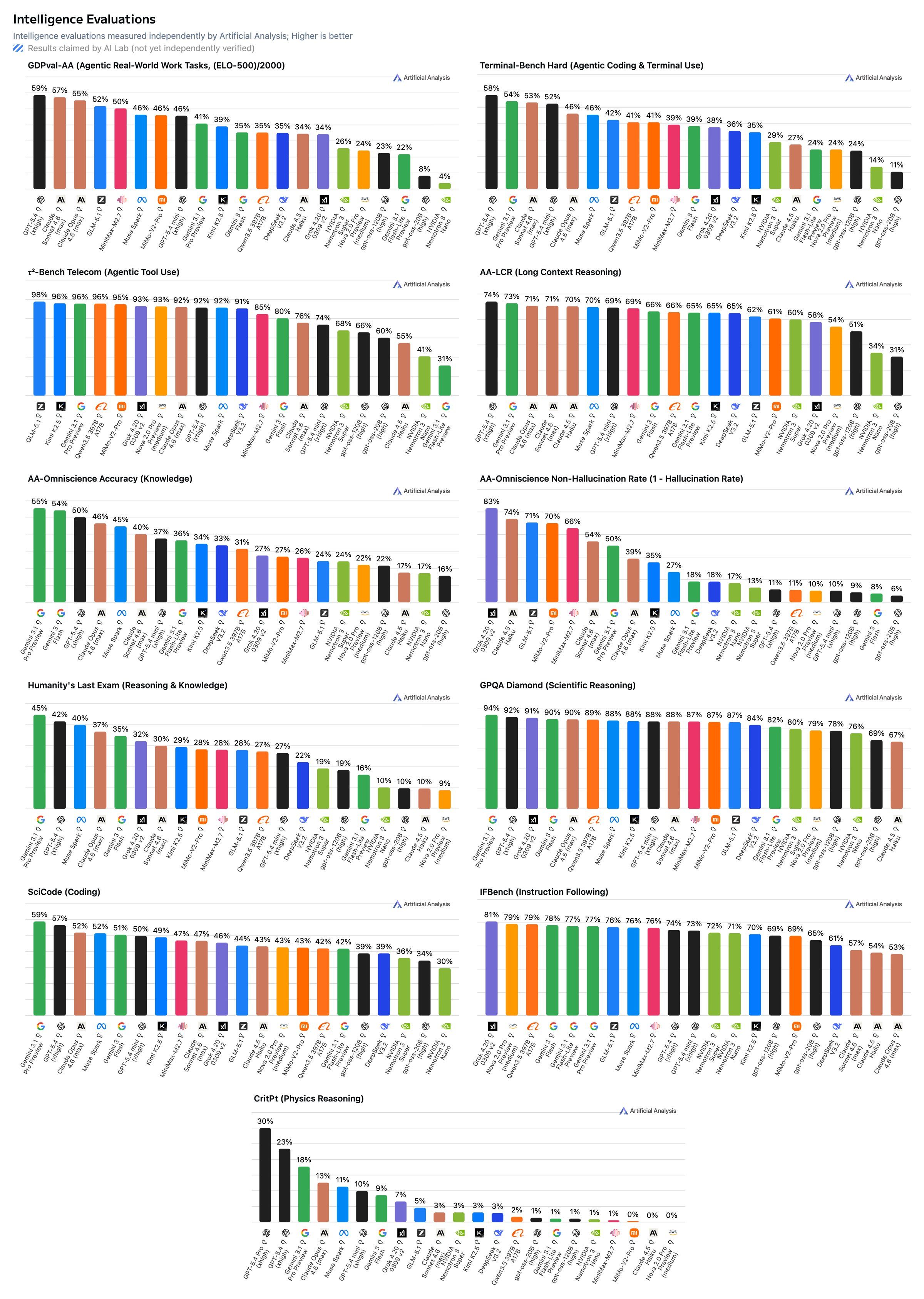 ➤ Agentic performance does not stand out. On GDPval-AA, our evalaution focused on real world work tasks, Muse Spark scores 1427, behind both Claude Sonnet 4.6 at 1648 and GPT-5.4 at 1676, but ahead of Gemini 3.1 Pro Preview at 1320. On On TerminalBench Hard, Muse Spark trails Claude Sonnet 4.6, GPT-5.4, and Gemini 3.1 Pro. Muse Spark joins others in achieving a high τ²-Bench Telecom score of 92%