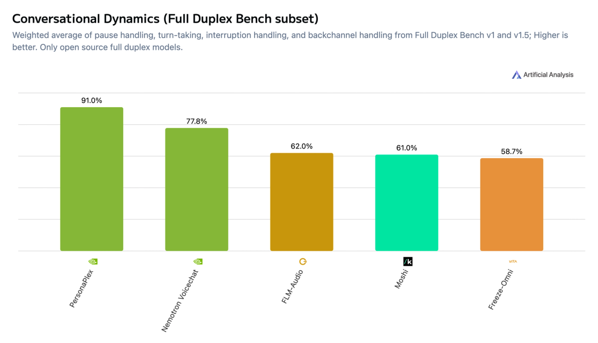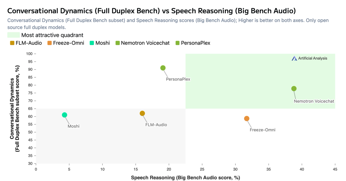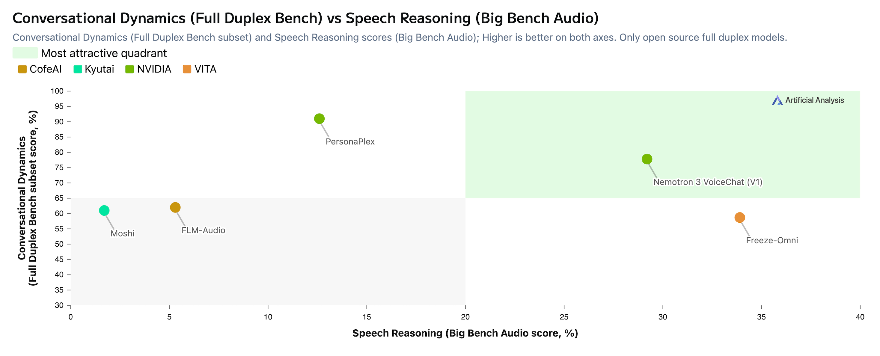Amongst full duplex open weights models, NVIDIA’s new Nemotron 3 VoiceChat, V1, leads in balancing these dimensions, setting itself apart from other models on the Conversational Dynamics vs. Speech Reasoning pareto frontier.