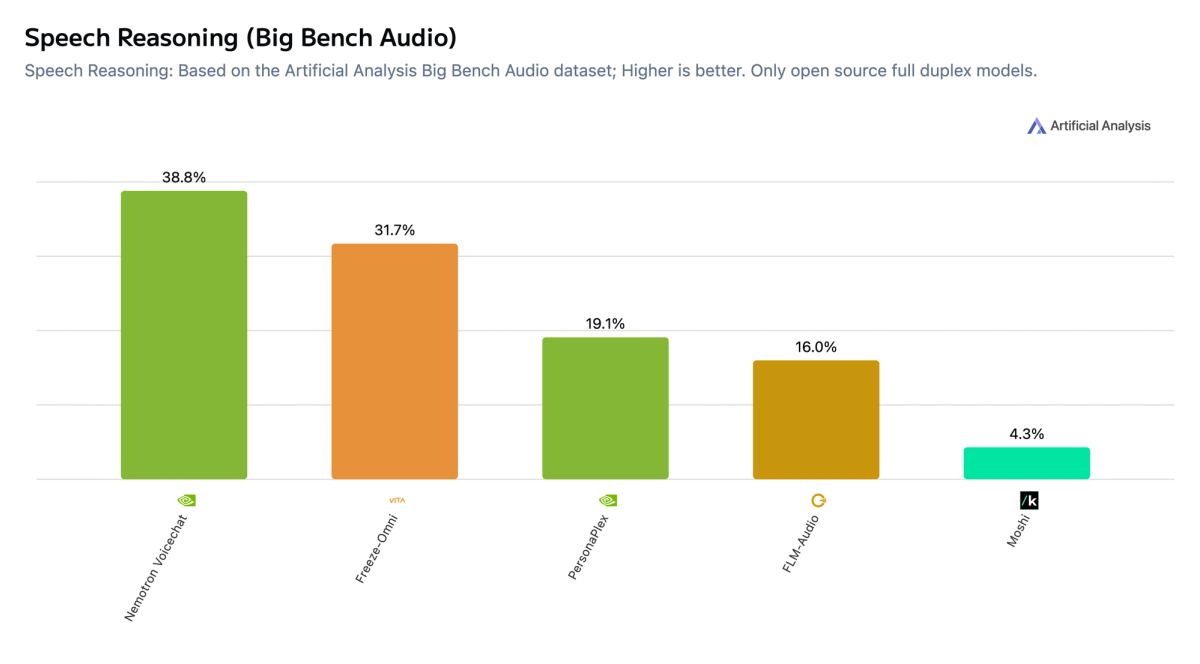 ➤ Speech Reasoning (Big Bench Audio): Nemotron 3 VoiceChat (V1) scores 29.2%, second among open weights speech to speech models behind Freeze-Omni (33.9%) and well ahead of PersonaPlex (12.6%), FLM-Audio (5.3%) and Moshi (1.7%)