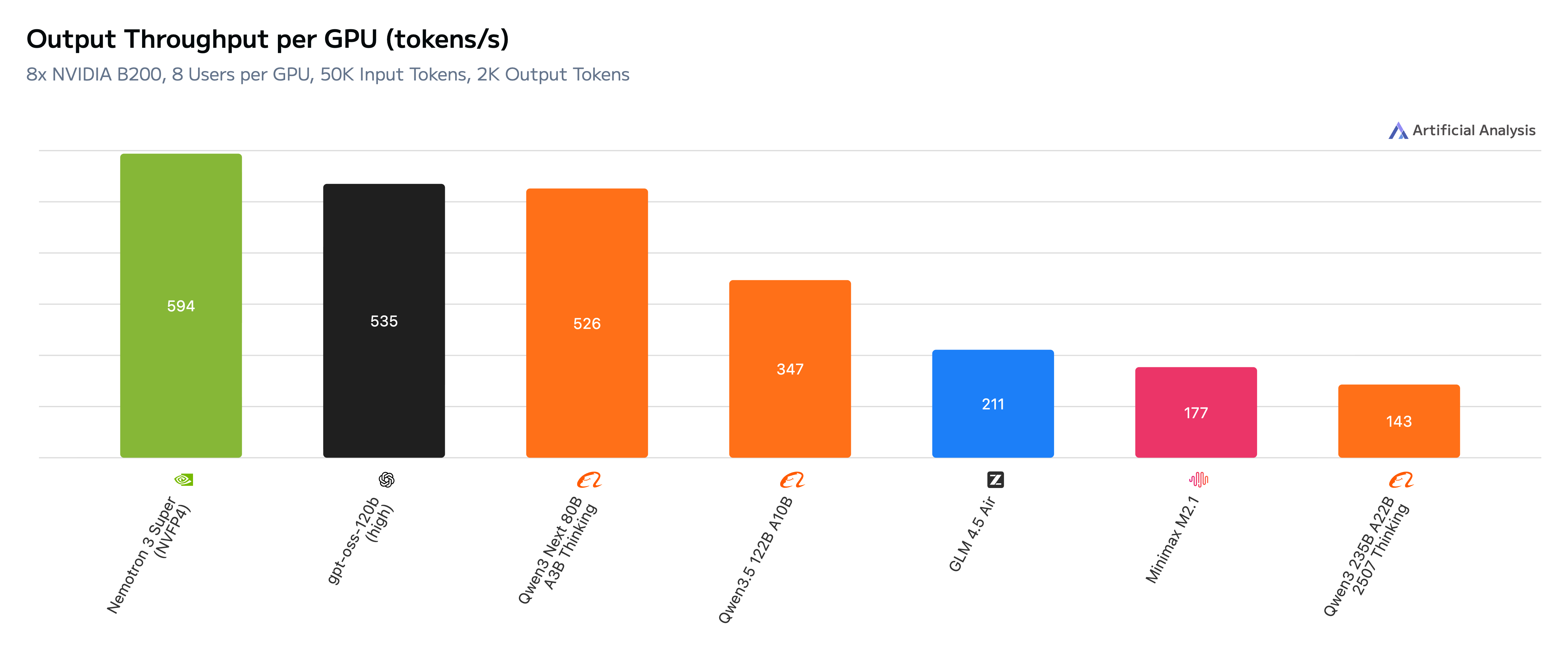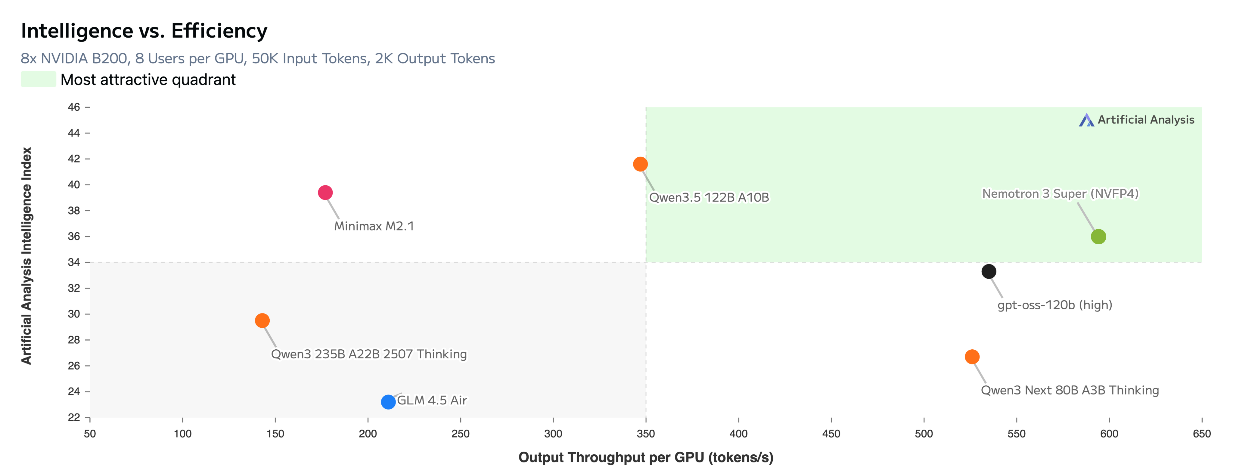 - NVIDIA focused on efficient intelligence with this release, and in our testing we found Nemotron 3 Super to have higher intelligence than gpt-oss-120b while enabling ~10% higher throughput per GPU