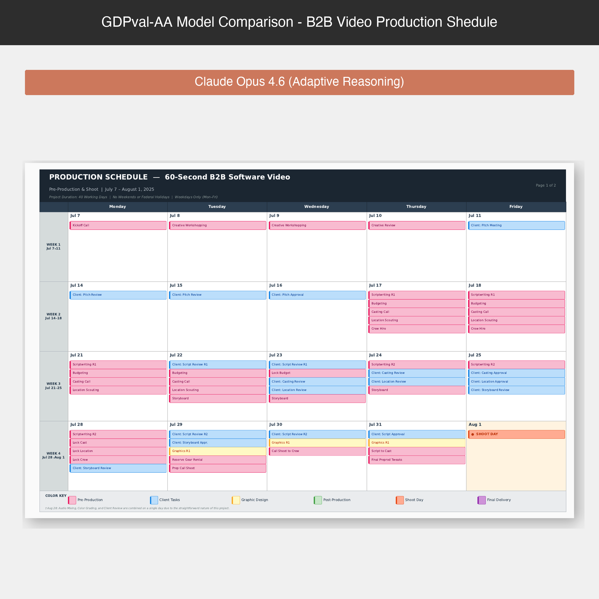 Claude Opus 4.6 produces a professional-looking production schedule with color-coded visual elements and structured layout