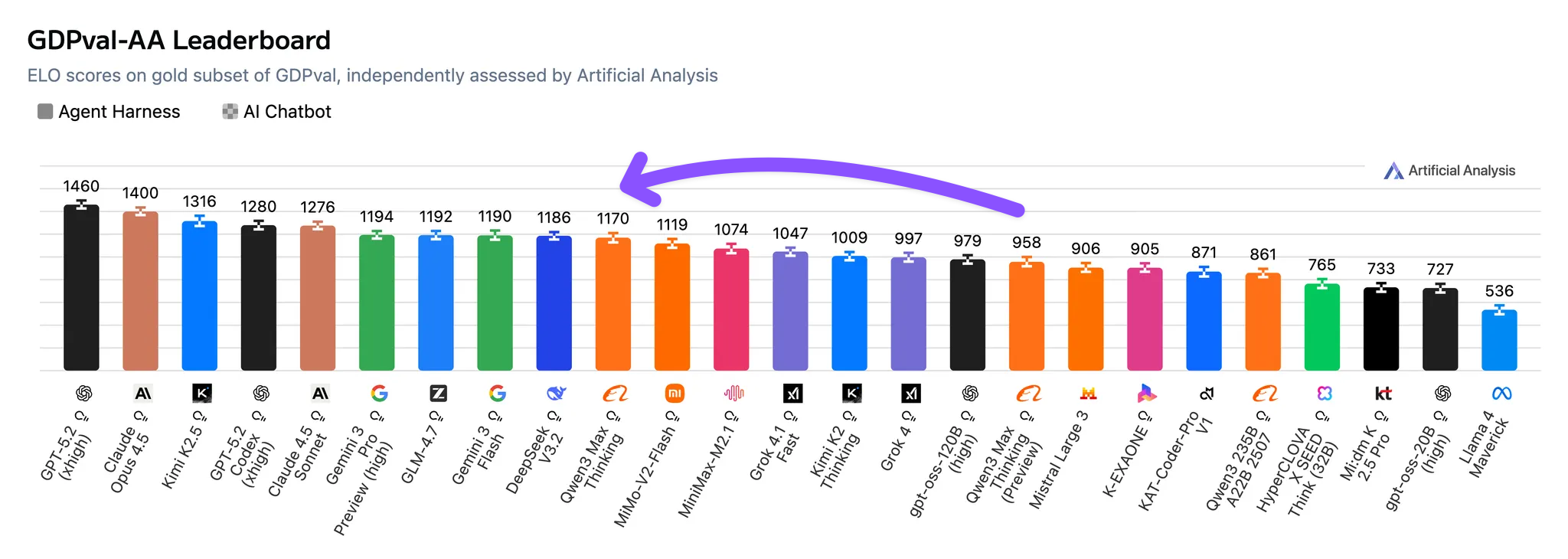 ➤ 🧠 Intelligence gains driven by general reasoning and instruction following: The 8-point jump from Preview is largely driven by improvements on general reasoning evaluations. HLE (Humanity's Last Exam) score doubles to 26% from the Preview version, and is ahead of DeepSeek V3.2 (22%), GLM-4.7 (25%), and MiniMax-M2.1 (22%). IFBench score jumps from 54% to 71%, leading peers from Chinese AI labs including Kimi K2.5 (70%) and GLM-4.7 (68%), representing a notable improvement in the model's ability to follow complex instructions. ➤ 🛠️ Improved agentic performance: Qwen3-Max-Thinking achievpes an ELO of 1170 on GDPval-AA, up from Qwen3-Max-Thinking (Preview)'s ELO of 958. This places it ahead of MiniMax-M2.1 (1074) but behind GLM-4.7 (1192), DeepSeek V3.2 (1186), and Kimi K2.5 (1316). GDPval-AA is our leading metric for general agentic performance, measuring models on realistic knowledge work tasks such as preparing presentations and analysis. Models are given shell access and web browsing capabilities in an agentic loop via our open source reference agentic harness called Stirrup