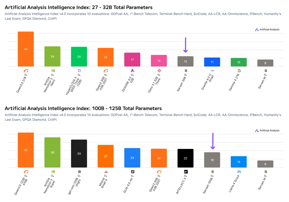 SarvamAI's Sarvam 105B and Sarvam 30B score 18 and 12 on the Artificial Analysis Intelligence Index respectively. Announced at the India AI Impact Summit 2026 and open-sourced under Apache 2.0, both are Mixture-of-Experts models trained entirely in India using compute provided under the IndiaAI Mission. Both support reasoning and non-reasoning modes.