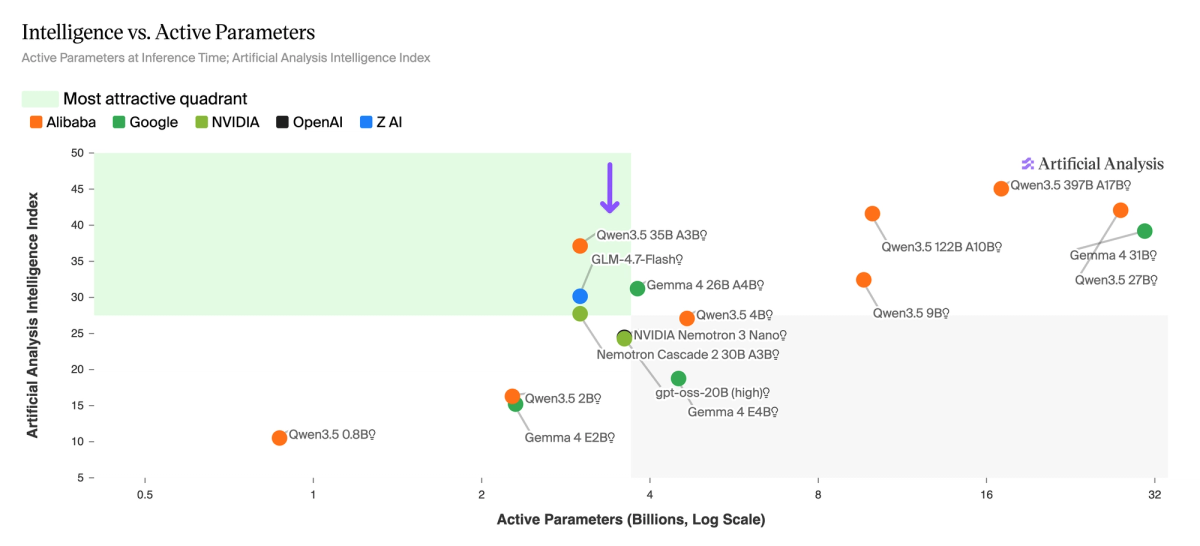 The ~3-4B active parameter tier is increasingly competitive - it now has six models competing from five different labs. A year ago, this tier did not exist. Qwen3.5 35B A3B (Reasoning) leads on the Intelligence Index at 37, followed by Gemma 4 26B A4B (Reasoning) at 31, GLM-4.7-Flash (Reasoning) at 30, Nemotron Cascade 2 30B A3B at 28, and gpt-oss-20B (high) and NVIDIA Nemotron 3 Nano 30B A3B (Reasoning) both at ~24. The rapid convergence of multiple labs on the ~3-4B active parameter point reflects a broader shift toward MoE architectures optimized for inference cost at the edge and smaller, more intelligent dense models overall.