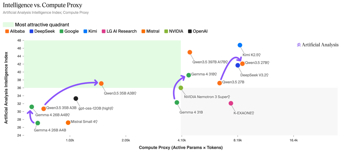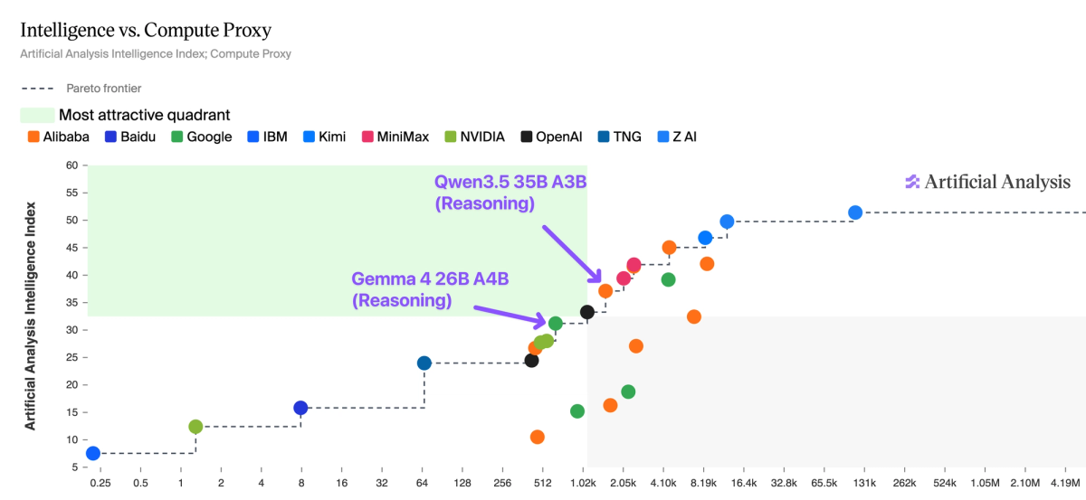 Gemma 4 is on the Pareto frontier of Intelligence vs. Compute Proxy - a metric we developed to estimate total inference compute, accounting for both active parameters and token generation. Qwen3.5 35B A3B (Reasoning) scores 37 but consumes 100M output tokens, while Gemma 4 26B A4B (Reasoning) scores 31 on just 73M tokens.