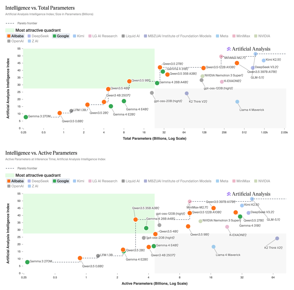 Alibaba's Qwen3.5 and Google DeepMind's Gemma 4 are the two recently released open weights families pushing the sub-32B total parameter model class forward. Both are available across multiple sizes with reasoning and non-reasoning variants and offer native multimodal input. Together, they represent the state of the art in open weights intelligence at this parameter count. Qwen3.5 27B reaches higher absolute intelligence on the Artificial Analysis Intelligence Index, while Gemma 4 31B is more token-efficient.